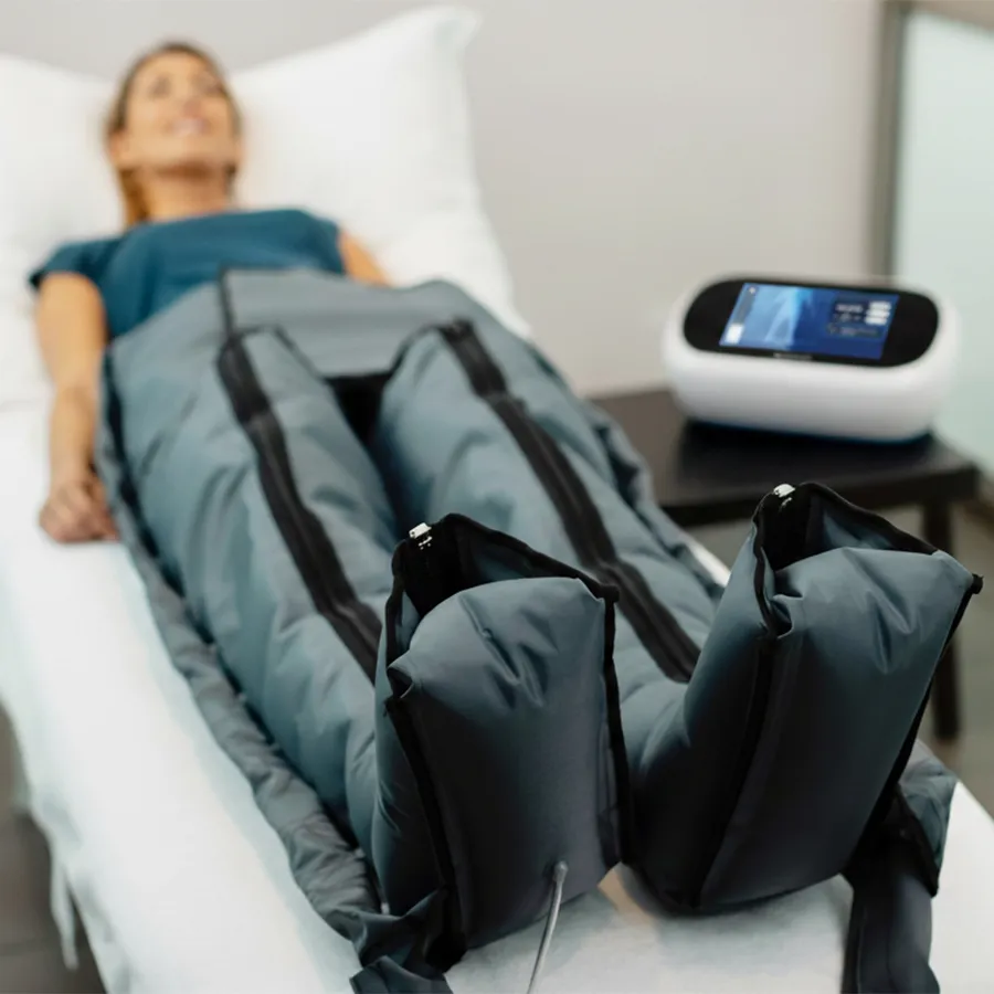 Ofrece 12 programas estéticos y deportivos, además de modo libre, con presión máxima de 130 mmHg, ideal para presoterapia avanzada y recuperación muscular.